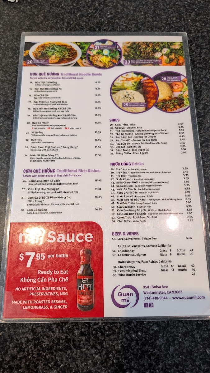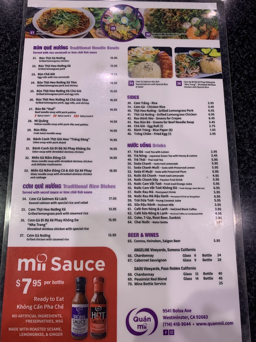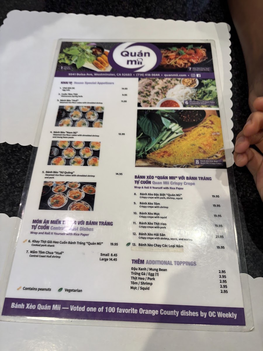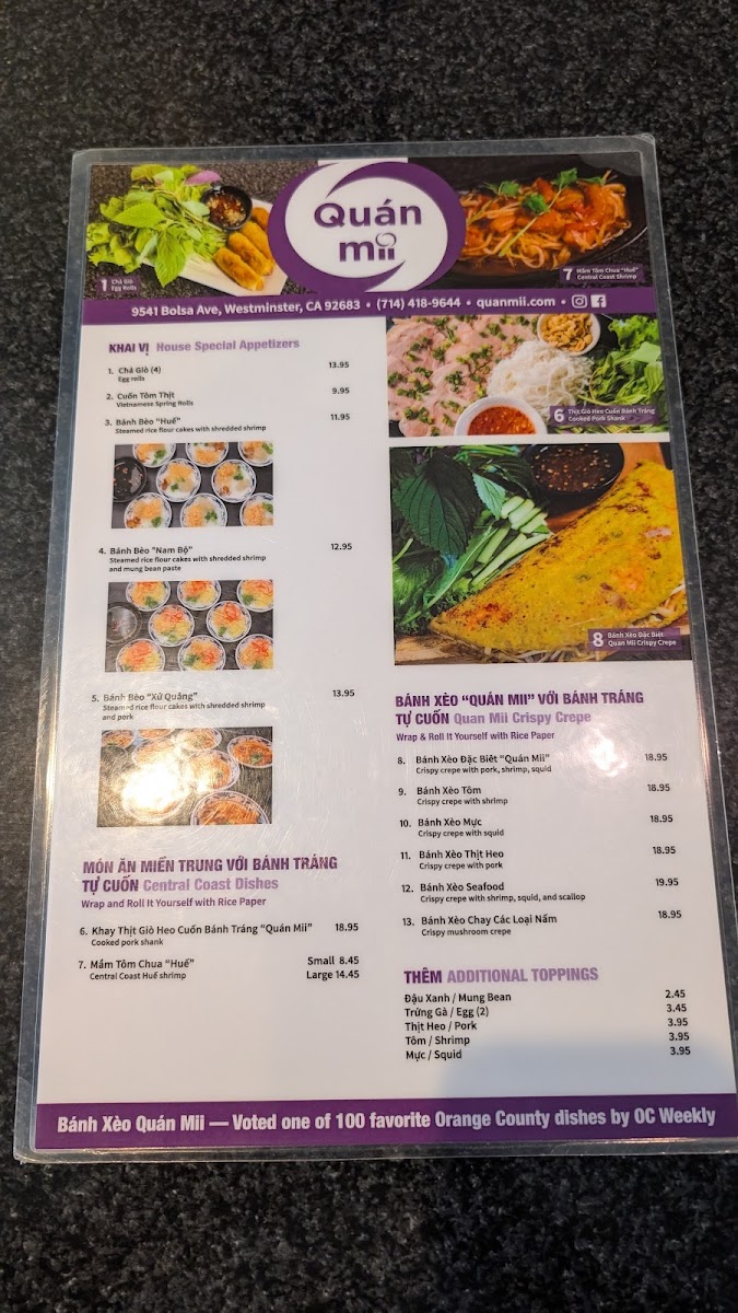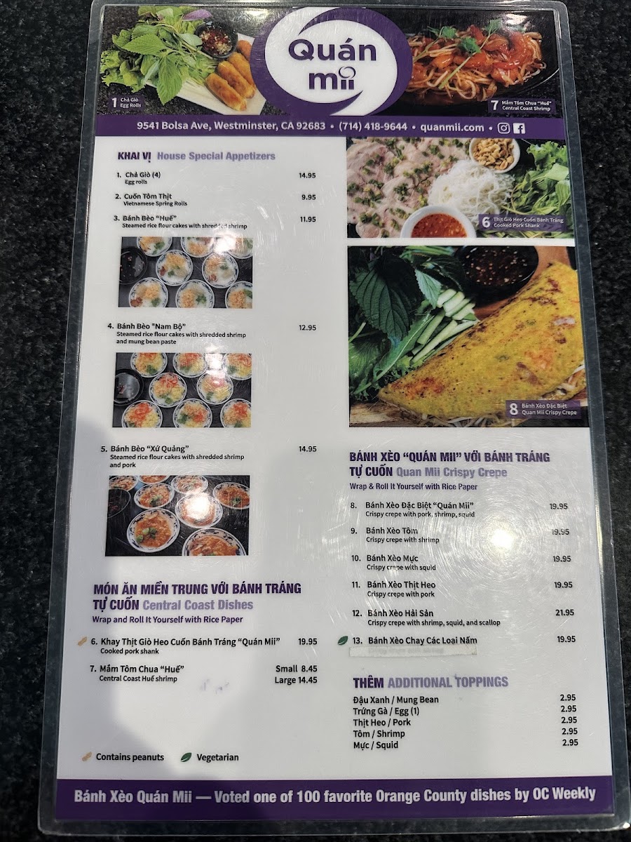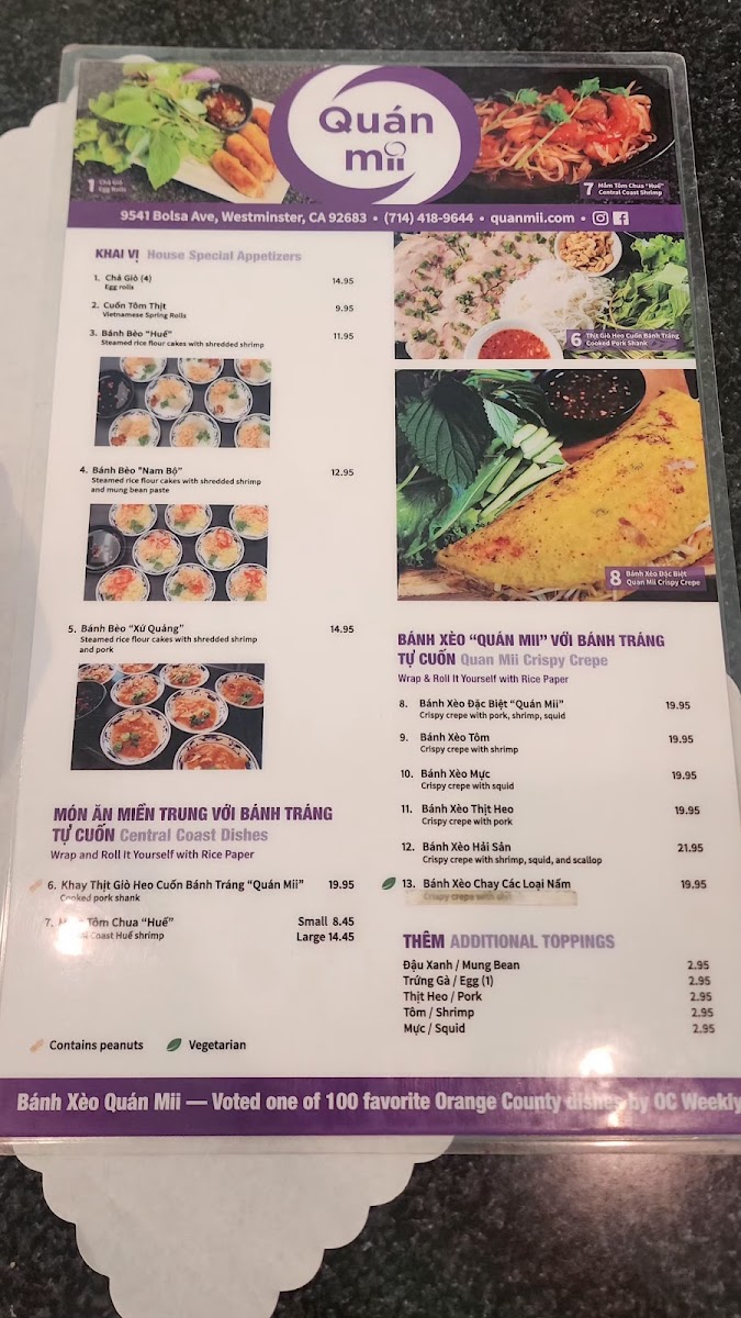 Quán Mii Restaurant, nestled in Westminster, CA, offers a delightful journey through Central Coast Vietnamese cuisine. The menu is a vibrant tapestry of flavors, featuring signature dishes like Bánh Bèo Khay, steamed rice cakes adorned with savory toppings, and the exquisite Bánh Xèo—crispy crepes filled with your choice of pork, shrimp, or squid. Each dish is crafted to showcase bold flavors and fresh ingredients, ensuring an authentic Vietnamese dining experience.